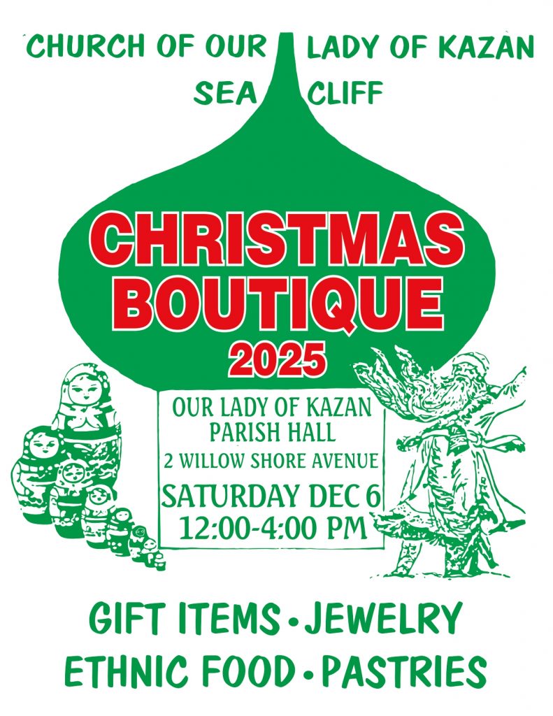 Take part in a Sea Cliff tradition, come to our annual Christmas bazaar! It will be in our parish hall on Saturday, December 6th from noon to 4 p.m. You’ll be able to buy delicious home-made borscht and pirogi, and you can round out your meal with a wonderful choice of home-made desserts.